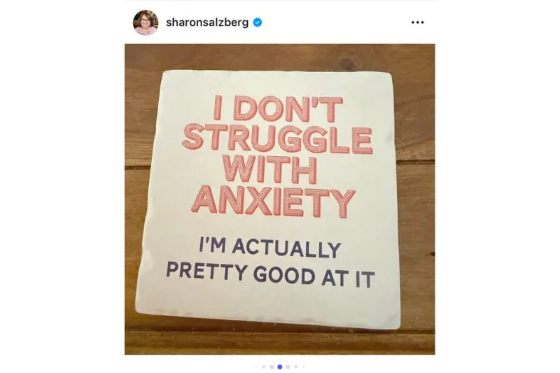 I often see the world through a meme-ified lens now—and I’m not sad about it. These small moments of connection are everywhere—sometimes in unexpected places. Imagine my delight when one of these memes appeared on meditation pioneer Sharon Salzberg’s Instagram feed. It reads, “I don’t struggle with anxiety. I’m actually pretty good at it.”
